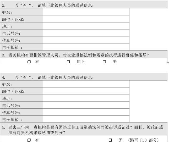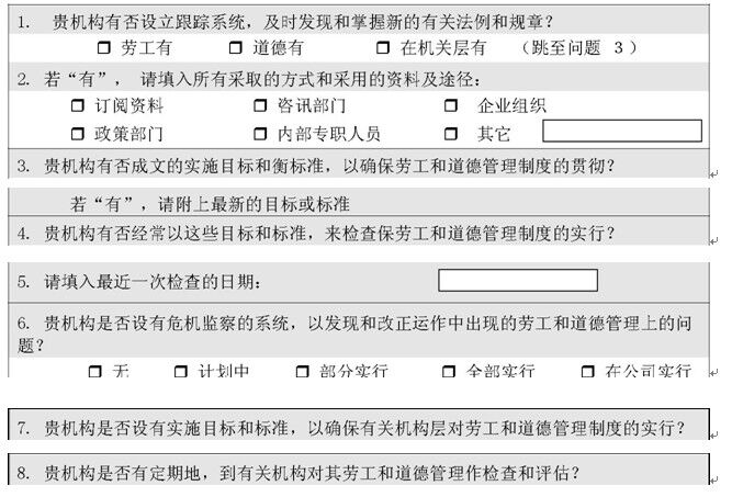1. 貴機(jī)構(gòu)有否成文的勞工和道德條例和規(guī)章?或其它類似文件?□ 有勞工□ 有道德□ 兩者皆無(跳至問題 5)若“有“,請附文件。(亦可附上公司遵守這些制度的聲明文件。)注:有關(guān)公司勞工和道德條例和規(guī)章,見調(diào)查表 C 部分