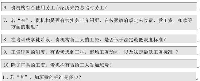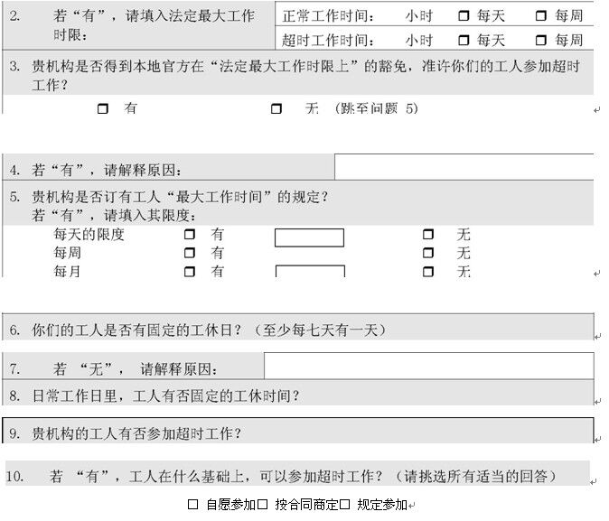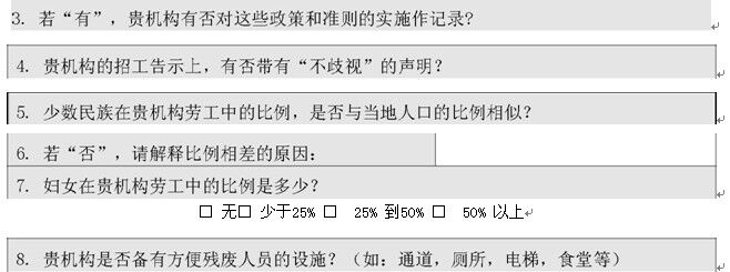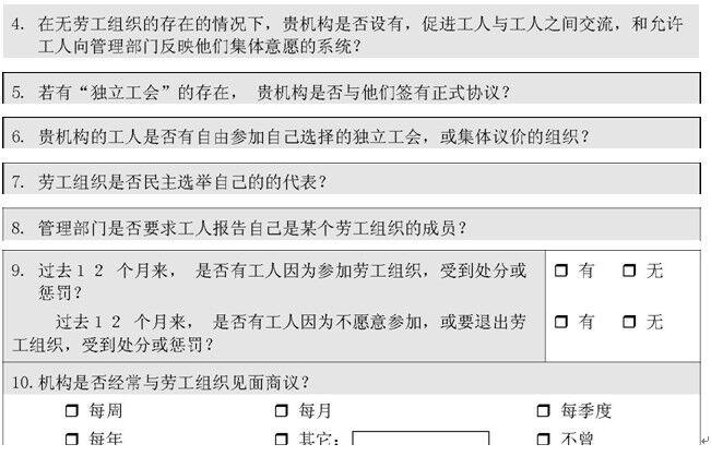 3. 貴機(jī)構(gòu)的勞工和道德制度文件,是否已用不同的語言,向當(dāng)?shù)貏诠ば麄髑宄?勞工□ 自由挑選職業(yè)□ 有□ 無□ 不征用童工□ 有□ 無□ 不歧視□ 有□ 無□ 人道的待遇□ 有□ 無□ 法定最低限度工資□ 有□ 無□ 工時□ 有□ 無□ 自由組織社團(tuán)□ 有□ 無